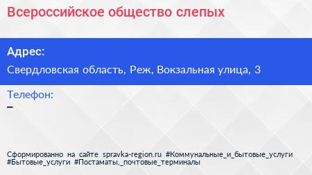 Всероссийское общество слепых по адресу Свердловская область, Реж, Вокзальная улица, 3 в дальнейшем Организация, размещена в следующих категориях: