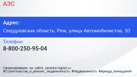 АЗС по адресу Свердловская область, Реж, улица Автомобилистов, 10 в дальнейшем Организация, размещена в следующих категориях: