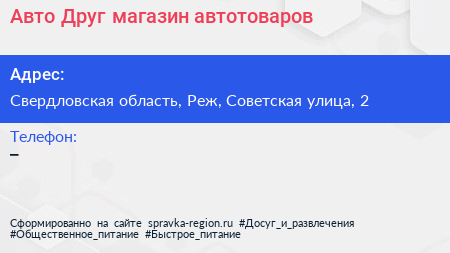 Авто-Друг, магазин автотоваров по адресу Свердловская область, Реж, Советская улица, 2 в дальнейшем Организация, размещена в следующих категориях: