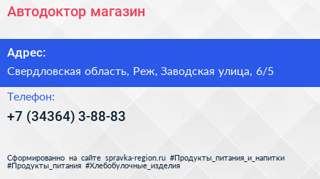 Автодоктор, магазин по адресу Свердловская область, Реж, Заводская улица, 6/5 в дальнейшем Организация, размещена в следующих категориях: