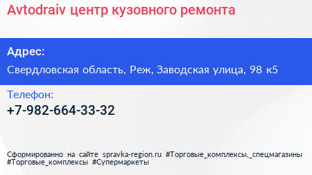 Avtodraiv, центр кузовного ремонта по адресу Свердловская область, Реж, Заводская улица, 98 к5 в дальнейшем Организация, размещена в следующих категориях: