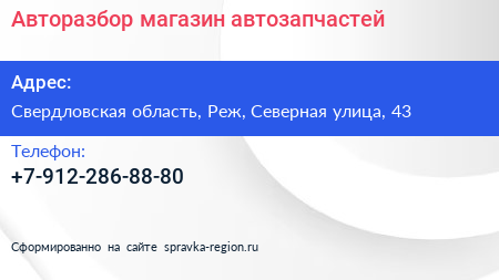 Авторазбор, магазин автозапчастей по адресу Свердловская область, Реж, Северная улица, 43 в дальнейшем Организация, размещена в следующих категориях: