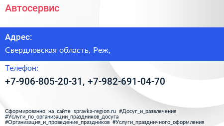 Автосервис по адресу Свердловская область, Реж, в дальнейшем Организация, размещена в следующих категориях: