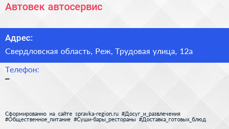 Автовек, автосервис по адресу Свердловская область, Реж, Трудовая улица, 12а в дальнейшем Организация, размещена в следующих категориях: