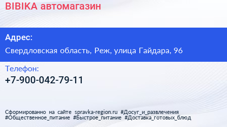 BIBIKA, автомагазин по адресу Свердловская область, Реж, улица Гайдара, 96 в дальнейшем Организация, размещена в следующих категориях: