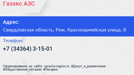 Газэкс, АЗС по адресу Свердловская область, Реж, Красноармейская улица, 8 в дальнейшем Организация, размещена в следующих категориях: