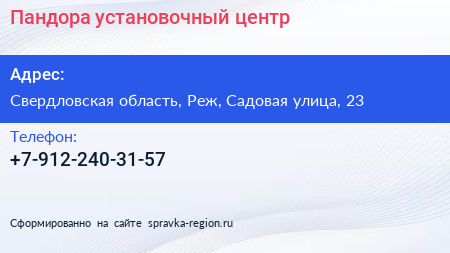 Пандора, установочный центр по адресу Свердловская область, Реж, Садовая улица, 23 в дальнейшем Организация, размещена в следующих категориях: