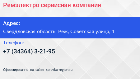 Ремэлектро, сервисная компания по адресу Свердловская область, Реж, Советская улица, 1 в дальнейшем Организация, размещена в следующих категориях: