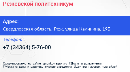 Режевской политехникум по адресу Свердловская область, Реж, улица Калинина, 19Б в дальнейшем Организация, размещена в следующих категориях: