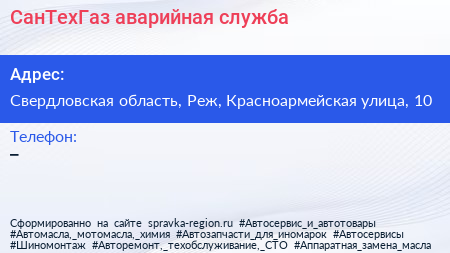 СанТехГаз, аварийная служба по адресу Свердловская область, Реж, Красноармейская улица, 10 в дальнейшем Организация, размещена в следующих категориях: