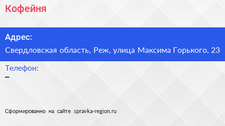 Кофейня по адресу Свердловская область, Реж, улица Максима Горького, 23 в дальнейшем Организация, размещена в следующих категориях: