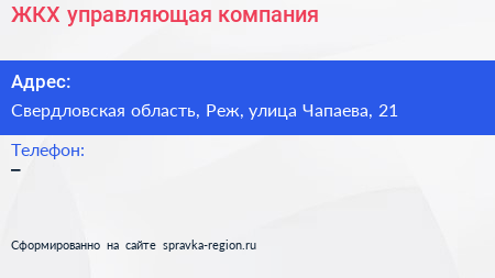 ЖКХ, управляющая компания по адресу Свердловская область, Реж, улица Чапаева, 21 в дальнейшем Организация, размещена в следующих категориях: