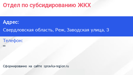Отдел по субсидированию ЖКХ по адресу Свердловская область, Реж, Заводская улица, 3 в дальнейшем Организация, размещена в следующих категориях:
