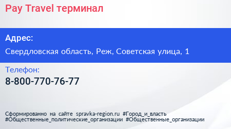 Pay.Travel, терминал по адресу Свердловская область, Реж, Советская улица, 1 в дальнейшем Организация, размещена в следующих категориях: