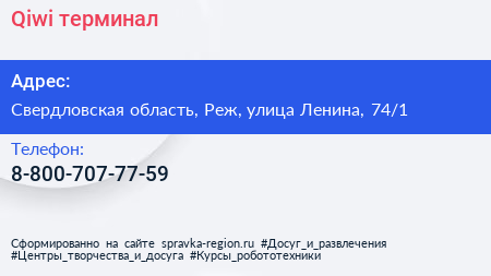 Qiwi, терминал по адресу Свердловская область, Реж, улица Ленина, 74/1 в дальнейшем Организация, размещена в следующих категориях: