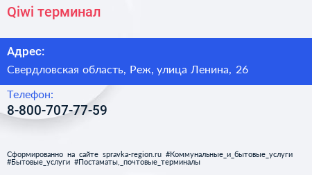 Qiwi, терминал по адресу Свердловская область, Реж, улица Ленина, 26 в дальнейшем Организация, размещена в следующих категориях: