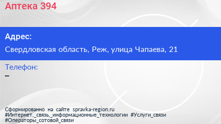 Аптека №394 по адресу Свердловская область, Реж, улица Чапаева, 21 в дальнейшем Организация, размещена в следующих категориях: