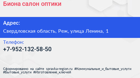 Биона, салон оптики по адресу Свердловская область, Реж, улица Ленина, 1 в дальнейшем Организация, размещена в следующих категориях: