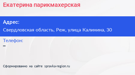 Екатерина, парикмахерская по адресу Свердловская область, Реж, улица Калинина, 30 в дальнейшем Организация, размещена в следующих категориях:
