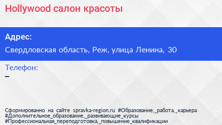 Hollywood, салон красоты по адресу Свердловская область, Реж, улица Ленина, 30 в дальнейшем Организация, размещена в следующих категориях: