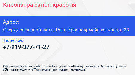 Клеопатра, салон красоты по адресу Свердловская область, Реж, Красноармейская улица, 23 в дальнейшем Организация, размещена в следующих категориях: