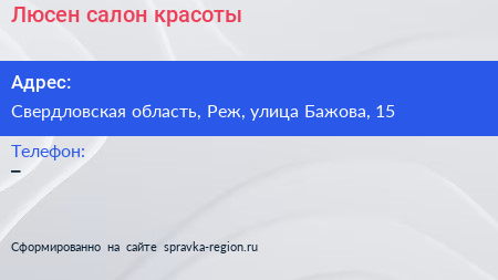 Люсен, салон красоты по адресу Свердловская область, Реж, улица Бажова, 15 в дальнейшем Организация, размещена в следующих категориях:
