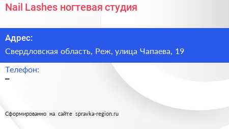 Nail & Lashes, ногтевая студия по адресу Свердловская область, Реж, улица Чапаева, 19 в дальнейшем Организация, размещена в следующих категориях: