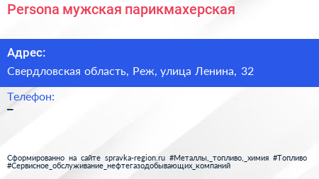 Persona, мужская парикмахерская по адресу Свердловская область, Реж, улица Ленина, 32 в дальнейшем Организация, размещена в следующих категориях: