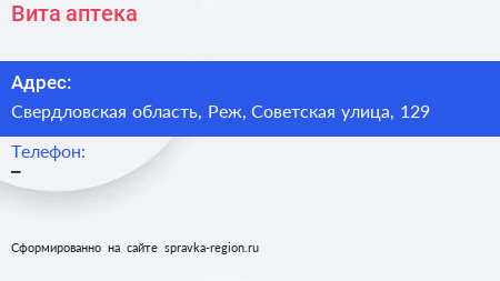 Вита, аптека по адресу Свердловская область, Реж, Советская улица, 129 в дальнейшем Организация, размещена в следующих категориях: