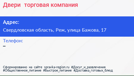 Двери+, торговая компания по адресу Свердловская область, Реж, улица Бажова, 17 в дальнейшем Организация, размещена в следующих категориях: