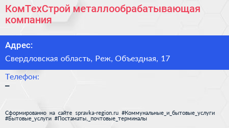 КомТехСтрой, металлообрабатывающая компания по адресу Свердловская область, Реж, Объездная, 17 в дальнейшем Организация, размещена в следующих категориях: