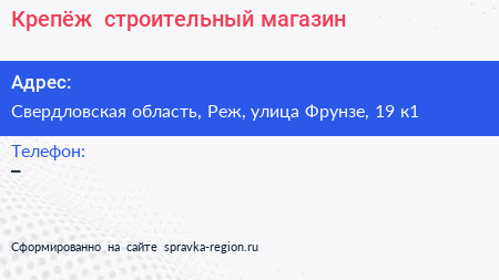 Крепёж+, строительный магазин по адресу Свердловская область, Реж, улица Фрунзе, 19 к1 в дальнейшем Организация, размещена в следующих категориях: