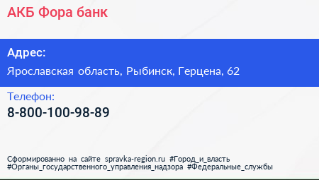 АКБ Фора-банк по адресу Ярославская область, Рыбинск, Герцена, 62 в дальнейшем Организация, размещена в следующих категориях:
