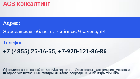 АСВ-консалтинг по адресу Ярославская область, Рыбинск, Чкалова, 64 в дальнейшем Организация, размещена в следующих категориях: