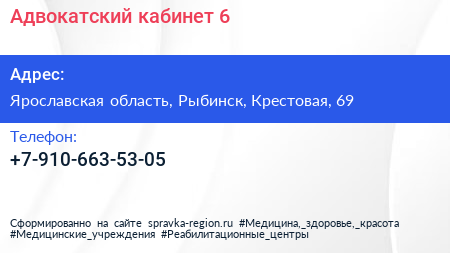 Адвокатский кабинет №6 по адресу Ярославская область, Рыбинск, Крестовая, 69 в дальнейшем Организация, размещена в следующих категориях: