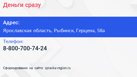 Деньги сразу по адресу Ярославская область, Рыбинск, Герцена, 58а в дальнейшем Организация, размещена в следующих категориях: