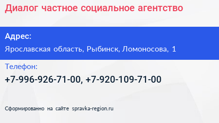 Диалог, частное социальное агентство по адресу Ярославская область, Рыбинск, Ломоносова, 1 в дальнейшем Организация, размещена в следующих категориях: