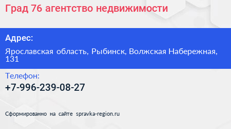 Град-76, агентство недвижимости по адресу Ярославская область, Рыбинск, Волжская Набережная, 131 в дальнейшем Организация, размещена в следующих категориях: