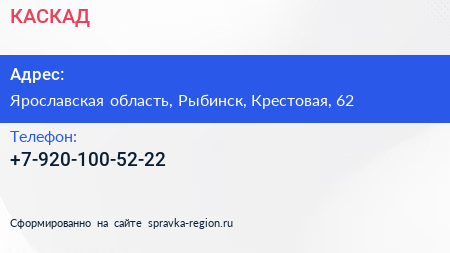 КАСКАД по адресу Ярославская область, Рыбинск, Крестовая, 62 в дальнейшем Организация, размещена в следующих категориях: