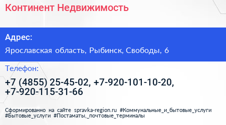 Континент Недвижимость по адресу Ярославская область, Рыбинск, Свободы, 6 в дальнейшем Организация, размещена в следующих категориях: