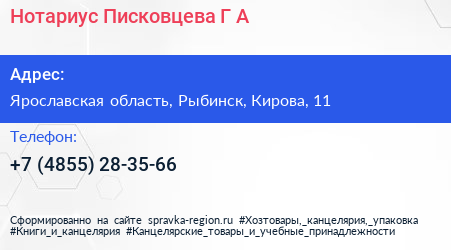 Нотариус Писковцева Г.А. по адресу Ярославская область, Рыбинск, Кирова, 11 в дальнейшем Организация, размещена в следующих категориях: