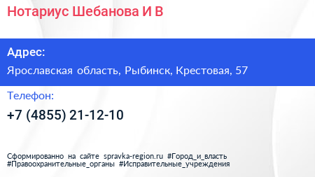Нотариус Шебанова И.В. по адресу Ярославская область, Рыбинск, Крестовая, 57 в дальнейшем Организация, размещена в следующих категориях: