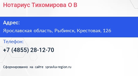 Нотариус Тихомирова О.В. по адресу Ярославская область, Рыбинск, Крестовая, 126 в дальнейшем Организация, размещена в следующих категориях: