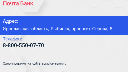 Почта Банк по адресу Ярославская область, Рыбинск, проспект Серова, 8 в дальнейшем Организация, размещена в следующих категориях: