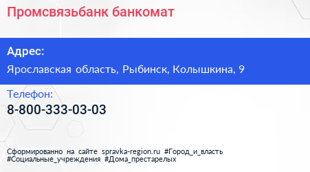 Промсвязьбанк, банкомат по адресу Ярославская область, Рыбинск, Колышкина, 9 в дальнейшем Организация, размещена в следующих категориях: