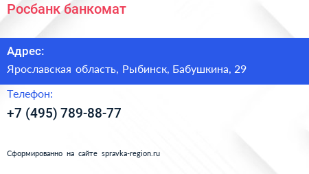 Росбанк, банкомат по адресу Ярославская область, Рыбинск, Бабушкина, 29 в дальнейшем Организация, размещена в следующих категориях: