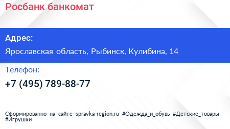 Росбанк, банкомат по адресу Ярославская область, Рыбинск, Кулибина, 14 в дальнейшем Организация, размещена в следующих категориях: