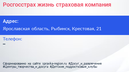 Росгосстрах жизнь, страховая компания по адресу Ярославская область, Рыбинск, Крестовая, 21 в дальнейшем Организация, размещена в следующих категориях: