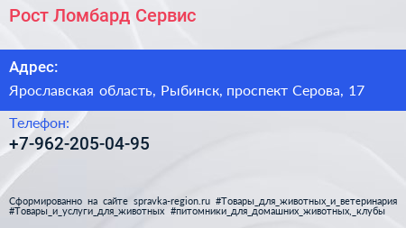 Рост Ломбард-Сервис по адресу Ярославская область, Рыбинск, проспект Серова, 17 в дальнейшем Организация, размещена в следующих категориях: