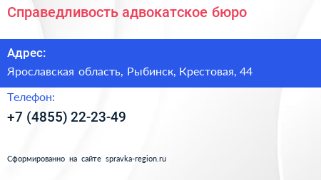Справедливость, адвокатское бюро по адресу Ярославская область, Рыбинск, Крестовая, 44 в дальнейшем Организация, размещена в следующих категориях: